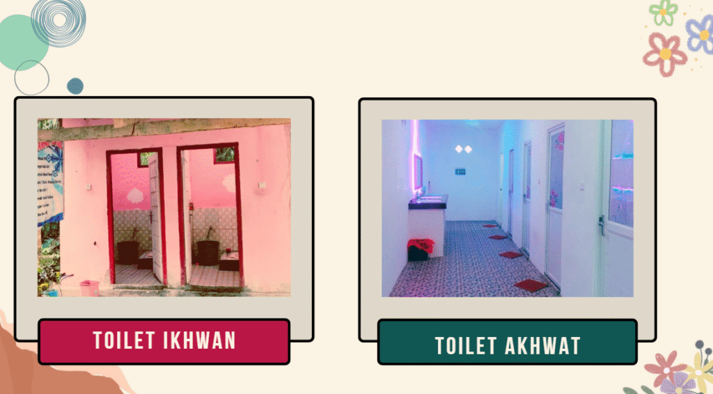 Toilet yang terpisah untuk ikhwan (laki-laki) dan akhwat (perempuan) mencerminkan kepedulian terhadap privasi dan kebutuhan gender. Toilet dilengkapi dengan fasilitas kebersihan yang baik.